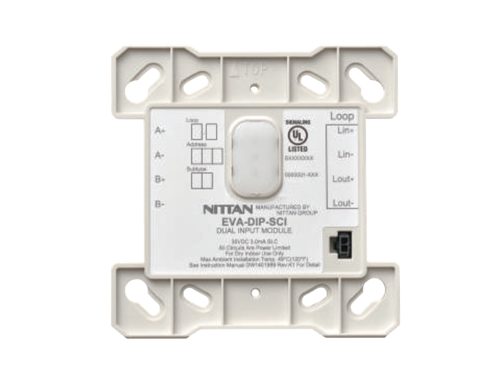EVA-DIP-SCI Dual Input Module with Short Circuit Isolator is intended for use in addressable two wire systems. The module monitors and transmits the status (normal, open, short, or active) of devices equipped with NC/NO dry contacts to a control panel. The initiating device circuit (IDC) can be wired on Class A (Style D & E) or Class B (Style B & C).